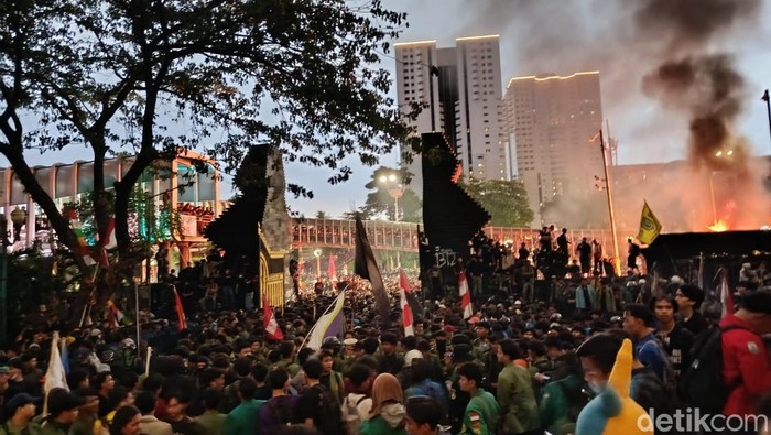 Pantauan detikcom, Jumat (29/8/2025), hujan mulai mengguyur pukul 18.05 WIB. Massa masih memenuhi area gerbang depan Polda Metro Jaya yang berada di Jalan Jenderal Sudirman. Massa juga melakukan pembakaran.