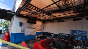 Bekasi – Pos polisi di Jati Asih, Bekasi, hangus terbakar saat aksi dini hari. Kini kondisinya sudah padam namun masih ditutup sementara waktu.